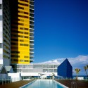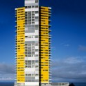 The west elevation of the satellite tower is fully glazed behind a continuous vertical sun screen of ellipsoid aluminium louvres which are motorised and individually controlled by the occupants of each unit. The western façade of the main tower is clad in yellow composite aluminium panels forming spandrels between horizontal strip glazing to the units shaded by horizontal motorised yellow aluminium louvres.