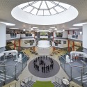 Different layers of learning spaces are arranged concentrically around the central space, with learning areas becoming more private as you move further from the centre. By moving away from conventional circulation spaces, the design encourages variation in how people move within the building and this leads to more social encounters between pupils and staff during the day. The typical horizontal split between floors has been dissolved by creating visual connections between all levels and Spanish steps further enhancing this connectivity
