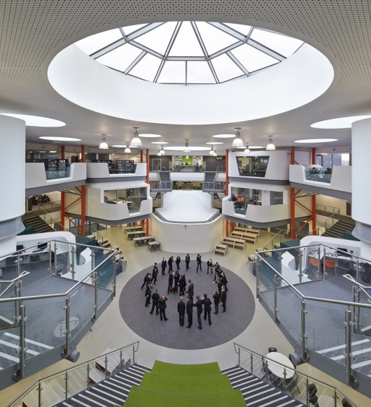The interior spaces have been designed so there is little segregation between staff and pupils. Staff areas are positioned in the cantilevered areas around the central space, offering passive supervision of the central space. The lack of barriers between student and staff is also felt in the dining areas, where everyone eats together, further encouraging an ethos of openness.