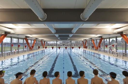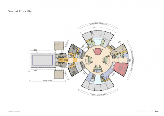 As well as staff areas, the cantilevered platforms on the upper levels house library and ICT facilities. The four wings of the building are on two levels, with eight distinct learning faculties for Mathematics, English, Science, Languages, Humanities, Technology, Theology and Sport. The sports hall, overlooking the grounds, is suspended over a new swimming pool. The positioning of the sports hall is due to site constraints to maintain an operational playing field whilst construction and demolition were underway.